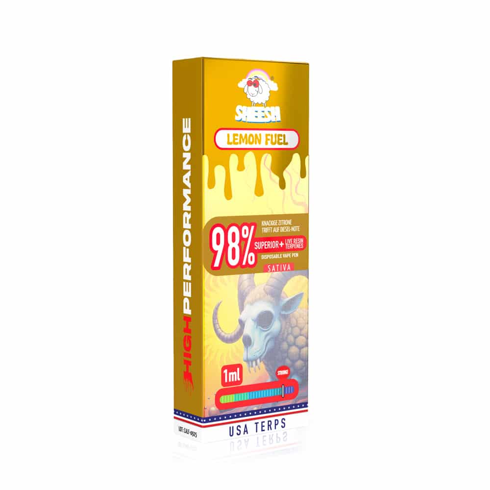 Die SHEESH Superior Line Lemon Fuel ist dein Ticket für intensiven Geschmack und ein High, das dich direkt in die Clouds katapultiert. Der unverwechselbare Mix aus erfrischender Zitrone mit legendärer Diesel-Note sorgt für ein einzigartiges Aroma, das du so schnell nicht vergisst. Mit einem Superior Gehalt von 98% bringt dir dieses Vape einen extrem starken, Sativa dominierten Effekt, der dich schweben lässt – perfekt für entspannte Sessions mit maximaler Wirkung.