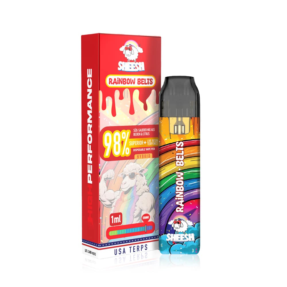 SHEESH Superior Line Rainbow Belts ist der Einweg-Vape für dich, wenn du Geschmack und Wirkung auf ein ganz neues Level bringen willst. Stell dir den süß-sauren Mix aus Beeren und Citrus vor, der dich schon beim ersten Zug packt – kombiniert mit der extrem starken Superior-Power von satten 98%. Ein Hybrid aus Indica und Sativa, der dich direkt in die Clouds katapultiert und schwerelos schweben lässt.